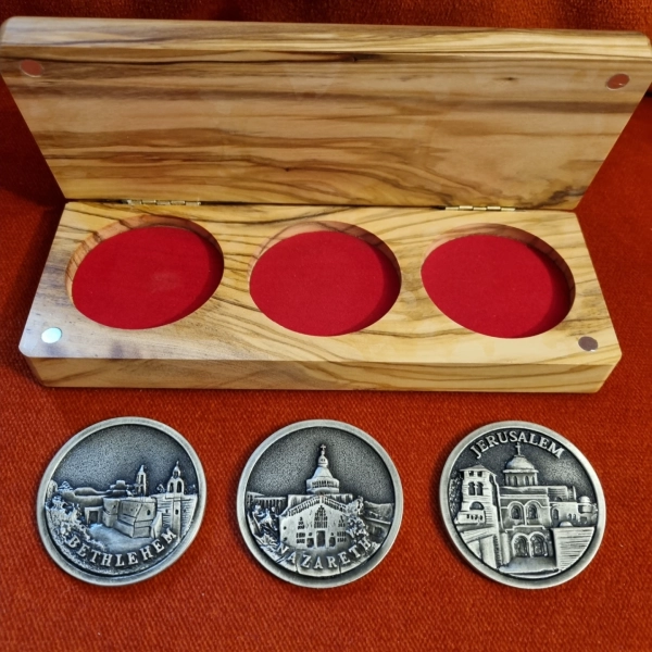 3 מדליות מקומות קדושים נצרות בקופסא זית עבודת יד