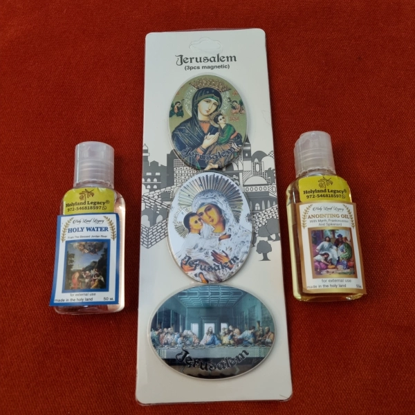 3 מגנטים אייקונות סעודה אחרונה נוצרים ירושלים מים קדושים שמן משיחה