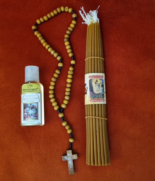 נר שעוות דבורים מכנסיית הקבר ירושלים שמן משיחה ושרשרת תפילה