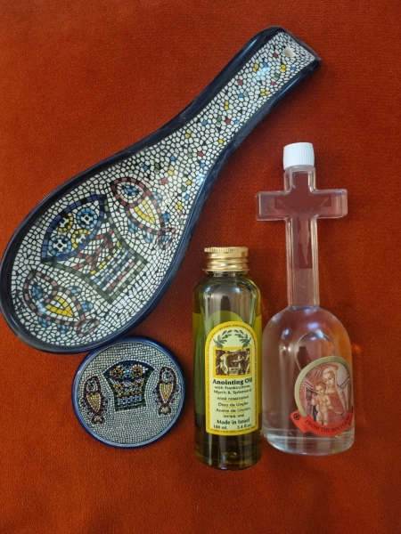 סט מים קדושים שמן משיחה נצרות כנרת טבחה נס הדגים והלחם
