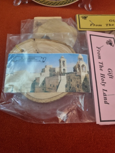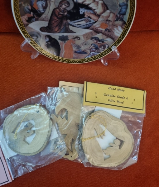 קשוטי עץ המולד מעץ זית וצלחת המולד בית לחם נצרות 15 סמ