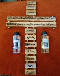 מתנה ליוון וקפריסין מים קדושים ושמן משיחה וצלב מעץ זית 50 סמ עם תפילה "אבינו שבשמים"