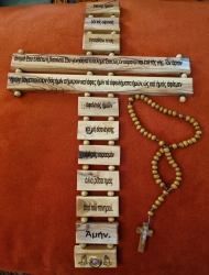מתנה ליוון וקפריסין שרשרת תפילה וצלב מעץ זית 50 סמ עם תפילה "אבינו שבשמים"